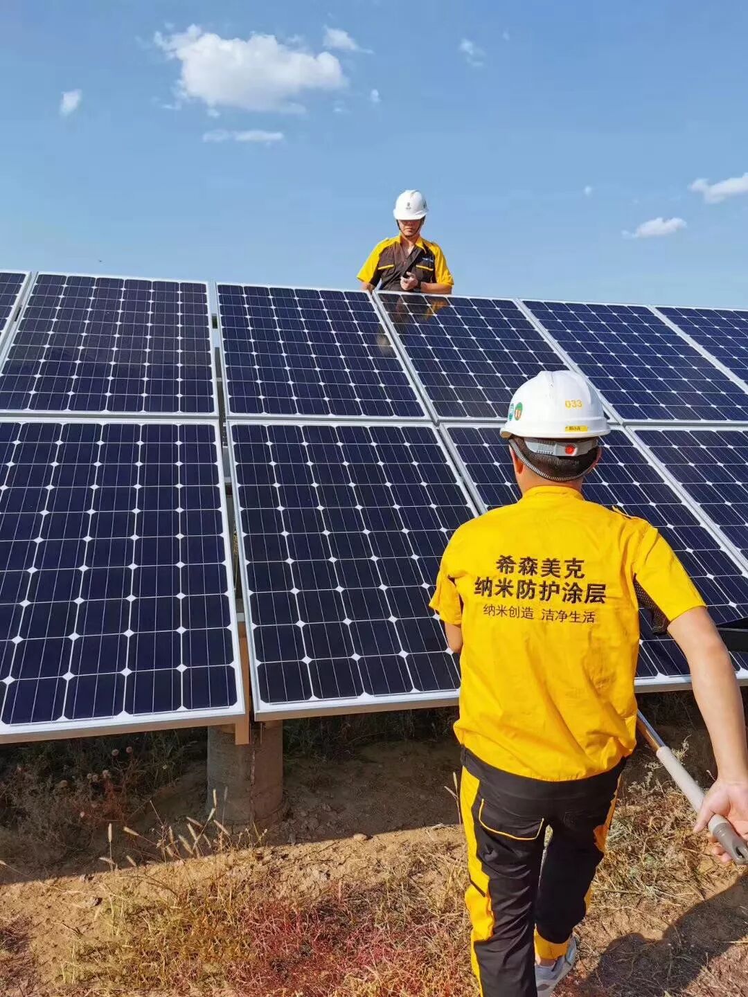 光伏玻璃 >> 自清洁解决方案 01 方案详情 随着经济发展,各国的太阳能光伏发电站建设与运营也进入高峰。与此同时,太阳能光伏发电板板因表面污染而导致发电效率降低也成为亟须解决的难题。 太阳能光伏发电板的自然污染难以避免,为维持光伏发电板的发电效率,需要定期人工清洁,这存在庞大的清洁费用。 而且,太阳能光伏电站基地多数建设在郊外地区(中东国家多数设置与沙漠地带,更是具有沙尘大、雨水少的气候条件),光伏发电板因沙尘覆盖大幅度降低发电效率,据统计:美国加尼福利亚洲的某太阳能光伏发电基地因污染,发电率降低了16%。在我国也因太阳能光伏发电基地因灰尘的堆积,发电率普遍降低了5~29%。 要持续保持光伏板表面清洁,在这些环境下的人工清洁是很困难且费用较高。而现有的人工常规清洗、机器人清洗、高压水清洁等方式,会对太阳能光伏发电板的表面增透光涂层造成较快的破坏而致透光率加快衰减。所以,利用自然条件抑制污染——防尘、自洁,已是太阳能光伏发电板的防污的首选方式。 02 光伏玻璃自清洁解决方案 希森美克光伏玻璃自清洁施工服务采用了最新纳米二氧化硅分形组合技术以及掺杂纳米三氧化钨和纳米氧化锡,能在物体表面形成50nm以下微细的凹凸,固化后的超薄涂层具有小于5°的亲水角度。由于掺杂高耐候性高耐化学性Pt超微粒子和光催化活性的纳米二氧化钛,涂层具有超强的耐候性,在可见光照射下,亲水性具有自修复功能,涂层同时可以抑制基材表面产生静电,使污渍不易附着基材,即使附着的污渍遇水即可自我清洁,始终保持光伏玻璃表面的透光性和清洁性, 降低晶硅光伏组件效率衰减,提升常规组件的发电量增益均值为2%。 采用自清洁防静电超亲水纳米防污涂层施工,经处理的光伏玻璃表面形成一层高密度稳固的纳米超亲水透明薄膜,使附着在材料表面的灰尘、污垢浮起并随着水膜重力很快滑落。 自清洁防污防静电超亲水纳米涂层自清洁功能非凡,无需人工清洗,利用雨水自洗,在下雨的情况下就能使污染物脱落。防静电防尘效果出色,高透光率,防止结露,增加玻璃硬度。涂层稳定性高,耐老化,抗冲刷,延长电池板使用寿命。 END 希森美克 与你分享纳米前沿黑科技 长按二维码关注我们