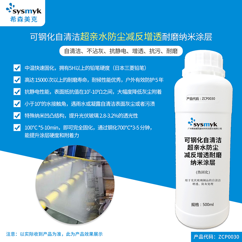 光伏组件玻璃生产商使用纳米涂层产品 【产品代码】 ZCP0030 【产品名称】 sysmyk®️可钢化超亲水防尘减反增透耐磨纳米涂层(热固化) 【产品特性】 ZCP0030是希森美克开发的一种单组分超亲水抗静电不沾灰增透无机纳米涂层,主用开发用于工厂端光伏玻璃的喷涂使用。采用了最新纳米二氧化硅分形组合技术,能在物体表面形成50nm以下微细的凹凸,固化后的超薄涂层具有小于 10°的亲水角度。纯无机成分,涂层具有超强的耐候性和耐磨性,涂层同时可以抑制基材表面产生静电,使灰尘不易附着基材,即使附着的灰尘遇水即可自我清洁,始终保持光伏玻璃表面的透光性和清洁性,降低光伏组件效率衰减,提升常规组件的发电量增益均值为 2.8-3.2%,相比传统的减反增透涂层,ZCP0030可以喷涂后,通过 700℃钢化处理 3-5 分钟,大幅度提升涂层的硬度到5H,同时维持良好的增透性和超亲水性。
