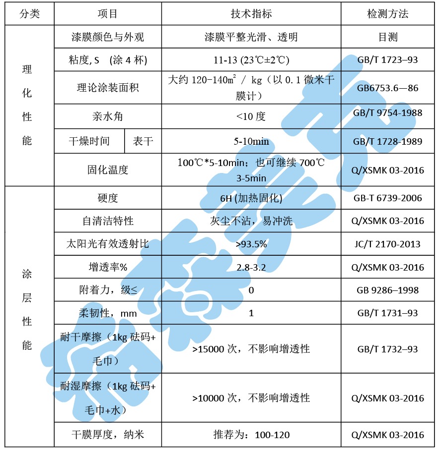 【技术创新点】 1.中温快速固化,拥有5H以上的铅笔硬度(日本三菱铅笔) 2.相比传统超亲水涂层1000次耐磨寿命,拥有高达15000次以上的耐磨寿命,纯无机成分,耐候性能优秀,户外有效防护5年 3.超强耐磨抗静电性能,表面抵抗值在107 -109之间,大幅度降低灰尘的附着 4.小于10°的水接触角,遇雨水或者凝露自清洁表面灰尘或者污渍,降低清洁频率 5.100℃ *5-10min,即可完全固化,通过钢化700℃*3-5分钟,能提升涂层硬度和附着力 6.特殊纳米凹凸结构,提升光伏玻璃2.8-3.2%的透光性 【固化方式】 100℃*5-10 分钟 ,700℃*3-5min 【技术参数】
